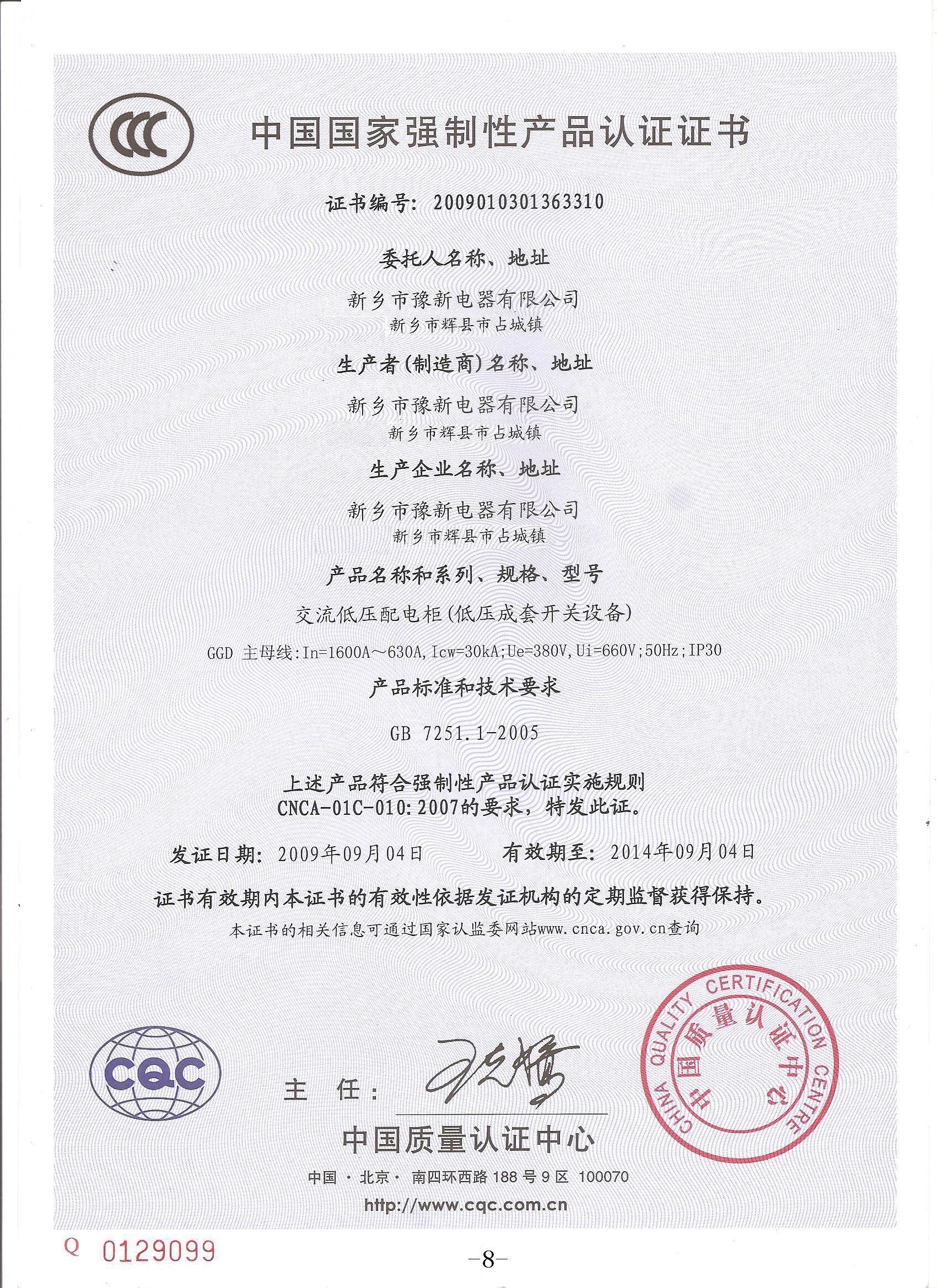 GGD低壓開關柜3C國家強制認證證書{中}