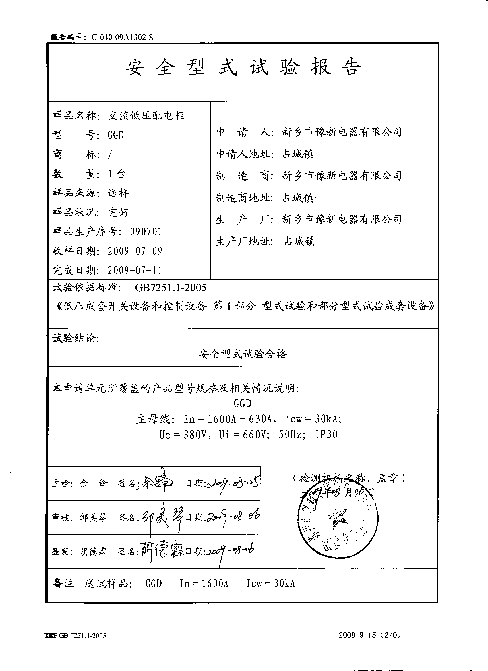 GGD低壓開關柜檢測報告